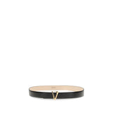 Versace’s calfskin V Belt is an elegant and distinctive accessory, embellished with a V-shaped sliding detail with an engraved enamel Versace logo. Completing the design is a buckle and brooch closure that combines functionality with refined style.