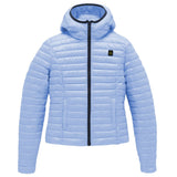 Discover the exquisite blend of functionality and elegance with Refrigiwear’s light jacket, a perfect testament to your sophisticated taste. Crafted in a refreshing light blue hue, this technical fabric piece features a chic elasticated hood and indulgent genuine duck down padding, providing both warmth and an impeccable style. Practicality meets sleek design with open side pockets and a smooth front zip fastening, making it an essential addition to your high-end fashion collection.