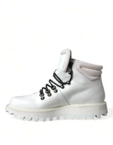 Gorgeous brand new with tags, 100% Authentic Dolce & Gabbana white Vulcano trekking boots and crafted from leather and feature a round toe, a ridged rubber sole, a lace-up front fastening, an ankle length and side and rear logo detailing.