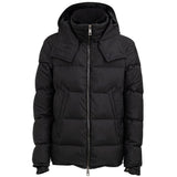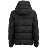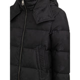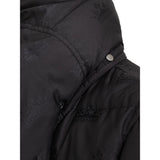 It is embellished with the brand’s signature crown motif and completed with two asymmetric pockets, a zip fastening, elasticated cuffs and a padded hooded neckline.