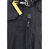 The Gobi bomber Jacket by Parajumpers is made of recycled and laminated nylon oxford with a water-repellent treatment. It features a double-slider front zipper closure and adjustable drawstring hood. It has six exterior pockets, including the iconic cargo pocket, and two interior pockets. Cuffs and bottom are ribbed for a comfortable fit. Completing the design are the Parajumpers patch on the sleeve and the iconic removable yellow tape hook and loop neck closure.