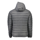 long-sleeved jacket with hood, 2 external pockets, 2 internal pockets, jacket bag, zip, application, logo