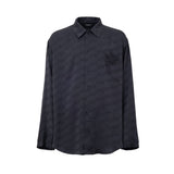 Balenciaga Allover Logo Over Homewear Shirt. In dark grey, allover tone-on-tone logo print, side patch pocket, classic collar, rounded bottom.
