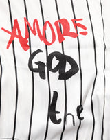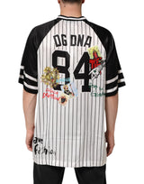 Gorgeous brand new, 100% Authentic Dolce & Gabbana T-shirt “Tradizione” oversized T-shirt from the men’s collection. Designed in a baseball jersey-inspired silhouette, this shirt features a striking pinstripe pattern contrasted by black raglan sleeves with sporty stripes. The front is decorated with vibrant, artistic graffiti-style graphics including the signature DG logo, religious and romantic imagery, and expressive text such as “Tradizione”, “Mon Amour”, “Amore”, and “God the”.
