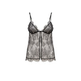 Allover lace triangle top, elasticized cord and shoulder straps, open front.