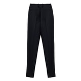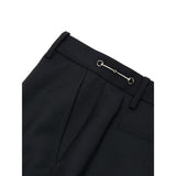 In black, straight fit, front fastening with hook and covered zip, two side welt pockets, two back pockets, straight leg and two internal slits on the bottom. On the sides at the waist iconic metallic details.