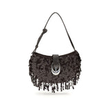 The Alana Shoulder Bag by Staud is a dramatic accessory, perfect for enhancing evening looks. With a half-moon silhouette and entirely covered in brown sequins, it features a dynamic fringed edge, an adjustable shoulder strap and the brand’s signature moon-shaped buckle. The magnetic closure and metallic details in silver finish complete the design with a functional and sophisticated touch.